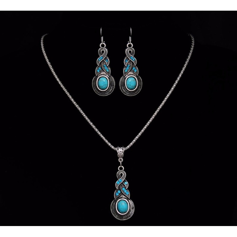 The LIKETHIS Jewelry Set is a stunning piece of jewelry perfect for any special occasion. This set includes a beautiful necklace and a pair of earrings, all made with high-quality Tibetan silver and featuring gorgeous blue turquoise crystal accents. The necklace and earrings are designed with an ethnic style and feature water drop shapes, adding an extra touch of elegance to any outfit.